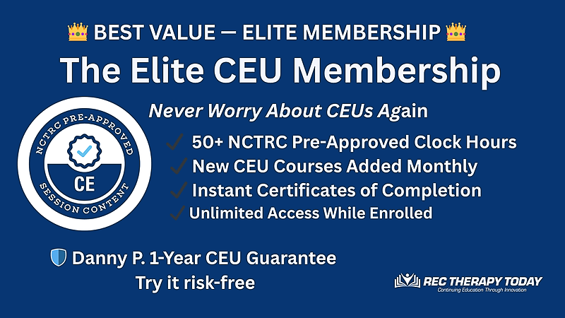 50+ clock hours included, plus a 2-clock-hour CEU course added monthly while enrolled. One simple annual payment of $297.47—far less than the cost of buying courses individually. Instant certificates. Created for rec therapists, by rec therapists.